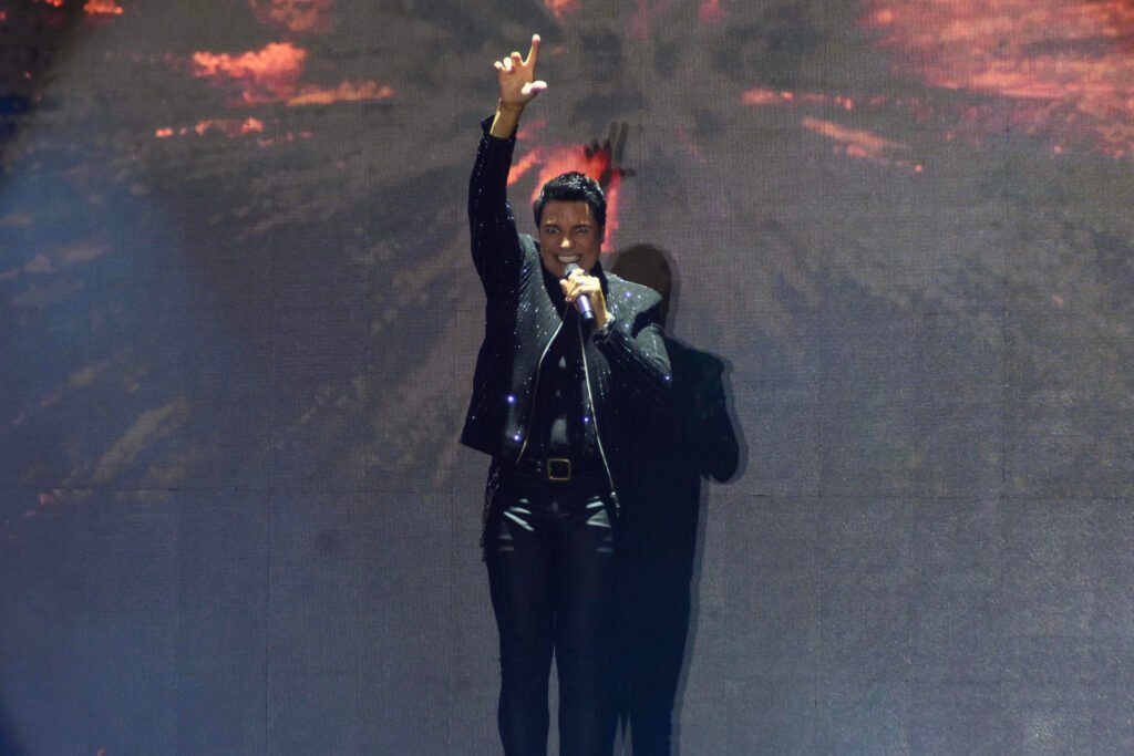 En la plenitud del espectáculo hay más de 20 personas en escena. La mitad son del cuerpo de baile, y a ellas se une el cantante, que hace «desaparecer» su micrófono para bailar, aunque en realidad su pantalón de cuero negro tiene una especie de cartuchera en su pernera izquierda, donde el micro se coloca para danzar a manos libres.